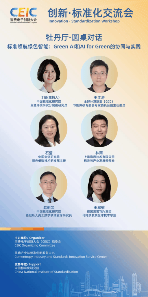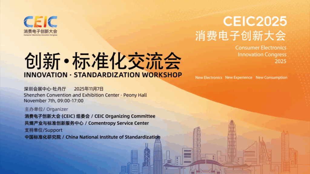 On November 7, 2025, as part of the 2025 Consumer Electronics Innovation Congress (CEIC), the Innovation · Standardization Workshop will host a cutting-edge dialogue on green intelligence at the Shenzhen Futian International Convention & Exhibition Center. Organized by the CEIC committee and the Comentropy Industrial & Standards Innovation Service Center, and supported by the China National Institute of Standardization, the workshop will bring together over 200 leading experts in standardization.