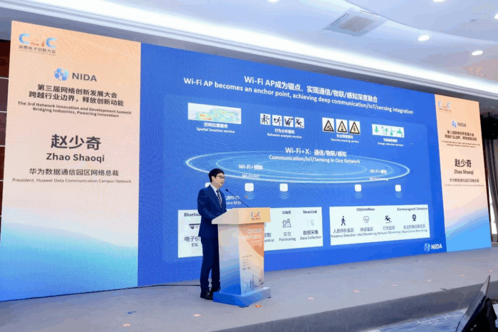 在近日由全球固定网络创新联盟(NIDA)主办的第三届网络创新发展大会上,华为数据通信产品线园区网络领域总裁赵少奇提出了“Wi-Fi + X”的理念,旨在通过Wi-Fi AP(接入点)融合物联、感知及安全能力,为各行业园区数智化转型提供新动力,这也与NIDA倡议的无线智能感知不谋而合。