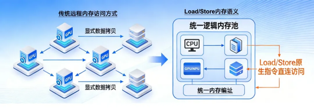 Load/Store 内存语义:替代传统TCP/RDMA 的消息语义,支持跨节点内存的原生指令访问,数据交互无需应用层干预;