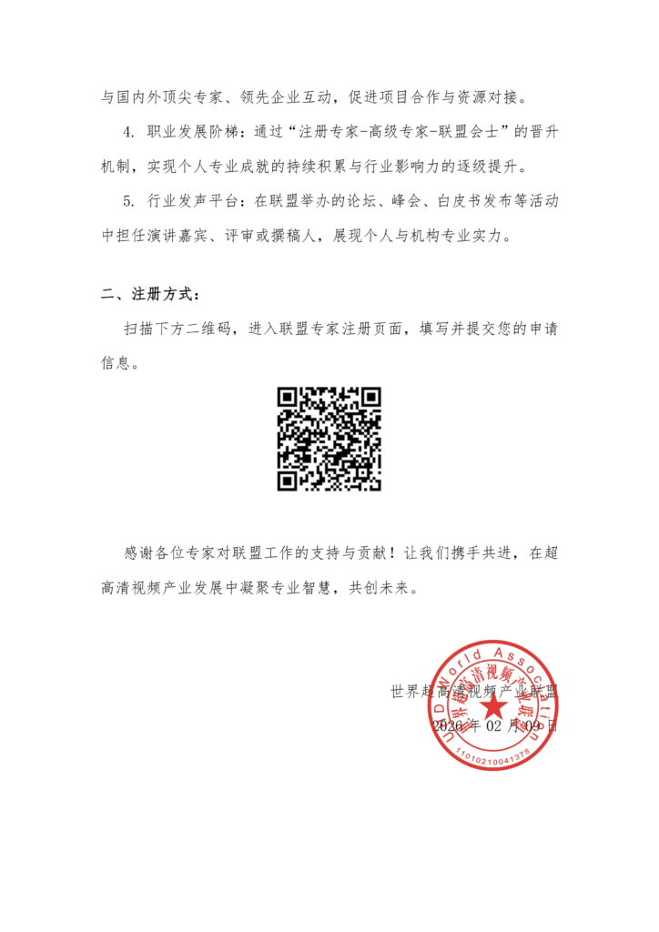 为夯实人才基础,有序推进未来会士评选工作,联盟现正式启动“专家注册与高级专家申报”工作,面向全产业链的专家学者、技术骨干、产业领袖及资深从业者开放注册通道。我们诚挚邀请各位符合条件的专业人士加入联盟专家库,共同推动超高清视频产业的协同创新与生态繁荣。