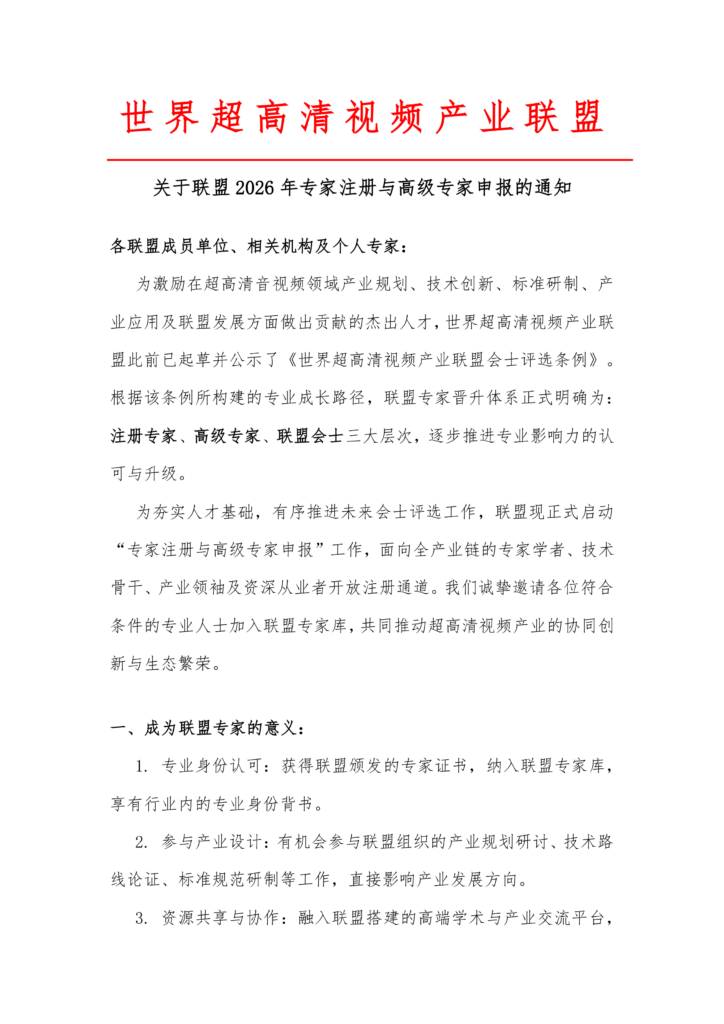 为激励在超高清音视频领域产业规划、技术创新、标准研制、产业应用及联盟发展方面做出贡献的杰出人才,世界超高清视频产业联盟此前已起草并公示了《世界超高清视频产业联盟会士评选条例》。根据该条例所构建的专业成长路径,联盟专家晋升体系正式明确为:注册专家、高级专家、联盟会士三大层次,逐步推进专业影响力的认可与升级。