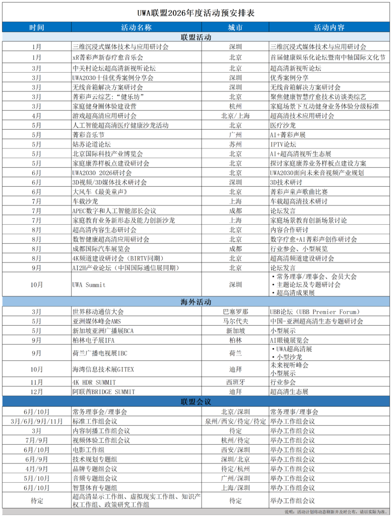为方便各会员及相关单位了解世界超高清视频产业联盟(简称“UWA联盟”)2026年度主要活动安排,更好地参与联盟组织参加和开展的活动,特编制了“UWA联盟2026年度活动预安排表”,欢迎各会员单位及社会各方积极参与,如有意见和建议,请与UWA联盟秘书处联系,联系人:韩璐,邮箱:hanlu@theuwa.com。