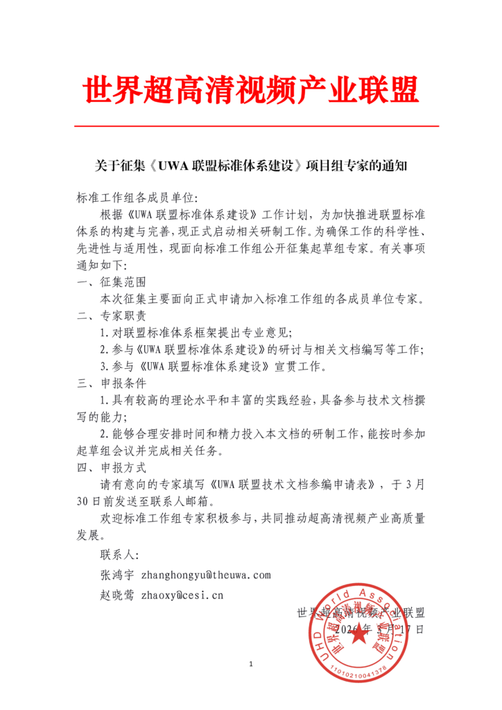 根据《UWA联盟标准体系建设》工作计划,为加快推进联盟标准体系的构建与完善,现正式启动相关研制工作。为确保工作的科学性、先进性与适用性,现面向标准工作组公开征集起草组专家。有关事项通知如下: