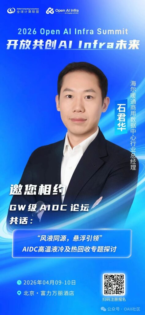 在此次 2026 Open AI Infra Summit ,石君华将在G瓦级AIDC论坛作主题为《“风液同源,悬浮引领”AIDC 高温液冷及热回收专题探讨》的分享,欢迎大家莅临此次大会现场沟通。