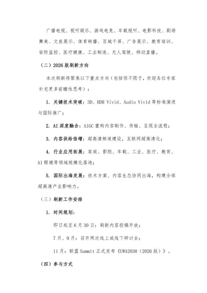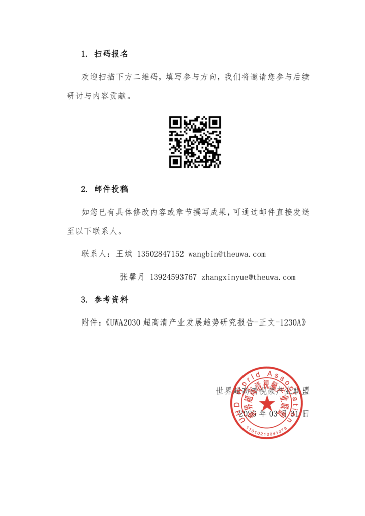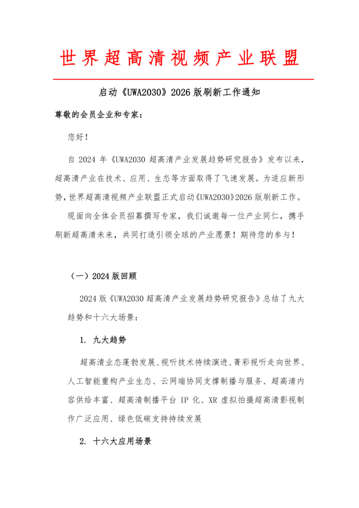 自2024年《UWA2030超高清产业发展趋势研究报告》发布以来,超高清产业在技术、应用、生态等方面取得了飞速发展。为适应新形势,世界超高清视频产业联盟正式启动《UWA2030》2026版刷新工作。