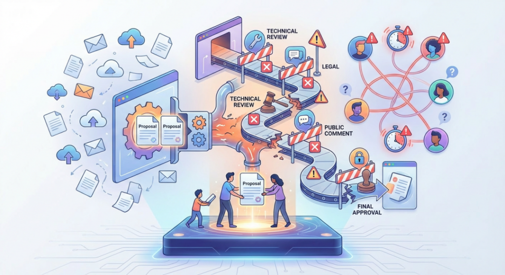 - 多阶段复杂性:联盟提案通常需要多个审查阶段—技术审查、法律评估、公众评论、最终批准
