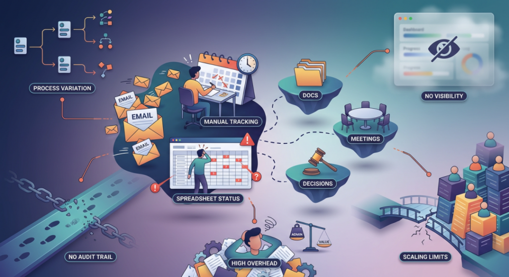 - 分散文档:提案资料、审查和决策最终散落在邮件、共享驱动和会议记录中