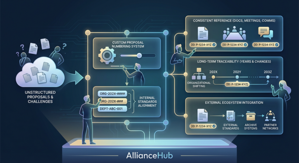 AllianceHub 与联盟文档系统的这种集成确保平台中创建的提案可在外部标准文档、会议记录和成员通信中无歧义地引用。