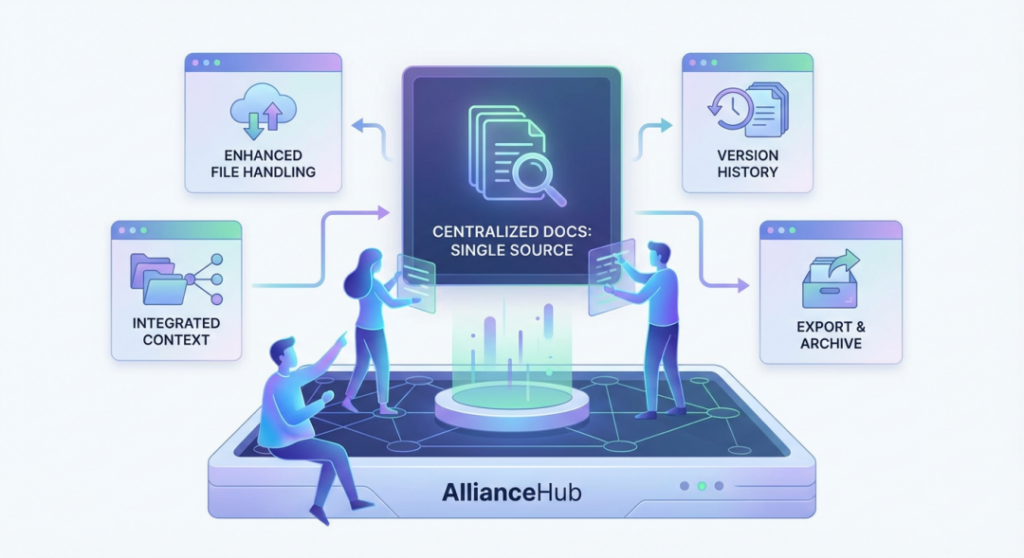 提案产生大量文档—技术规范、研究论文、会议材料、审查反馈。AllianceHub 提供: