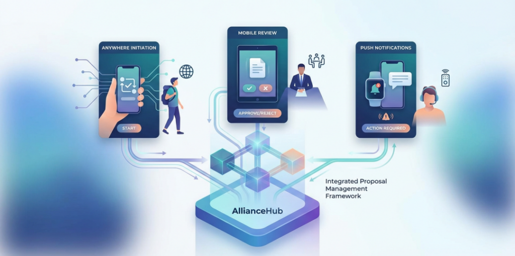 这种移动优先方法确保当关键人员旅行或远程工作时提案工作流不会停顿。需要紧急批准的提案即使批准官员在会议之间时也能推进。