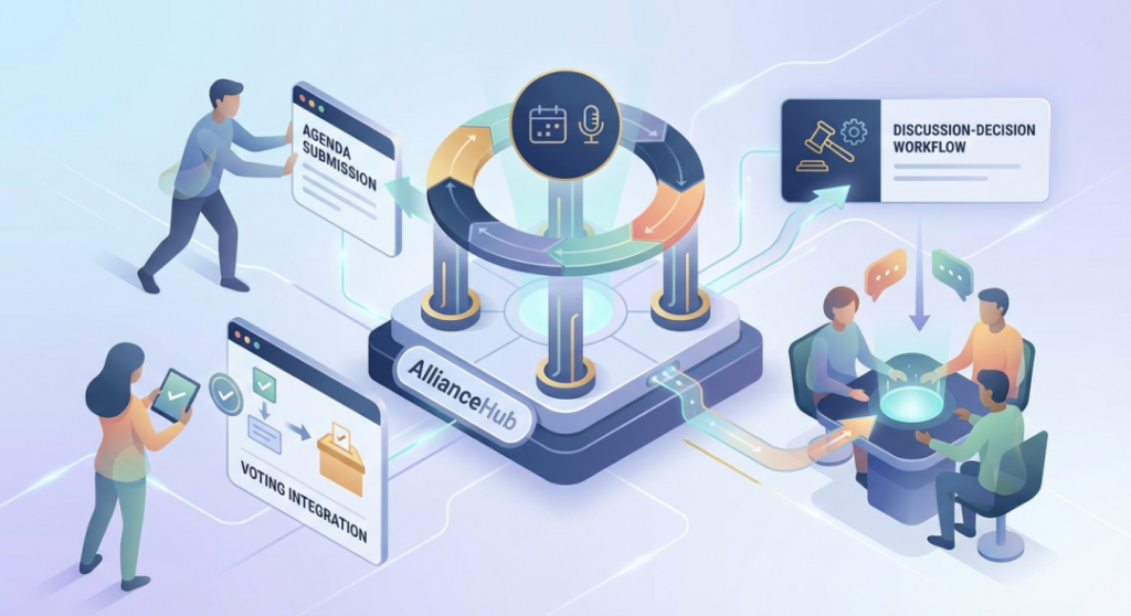 提案并非孤立存在—它们在会议中讨论、精炼和决定。AllianceHub 集成这些工作流:
